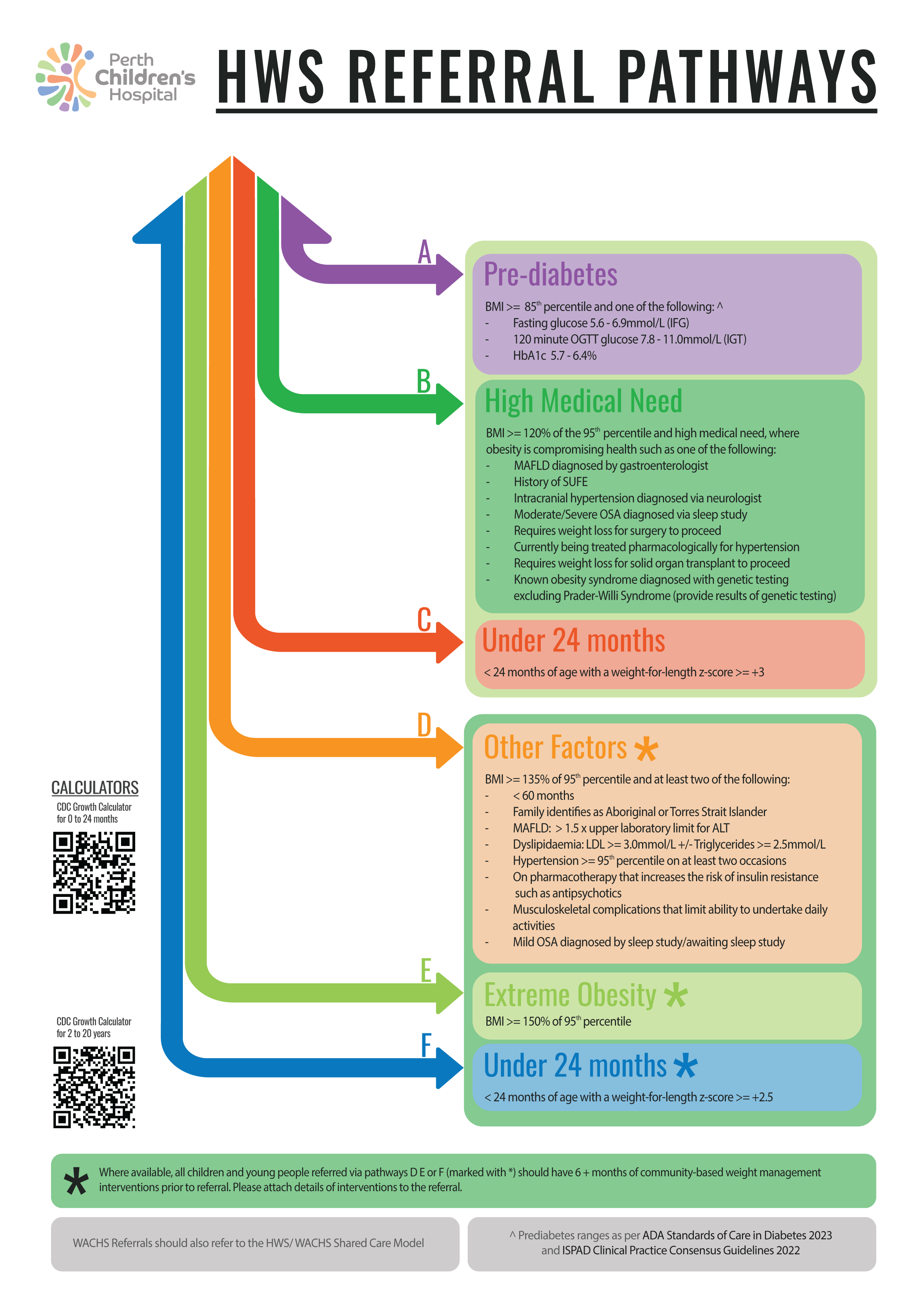 here. Measurements and evidence of investigations must be included for all categories. Children and young people referred via pathways D, E or F should have 6 + months of community-based weight management interventions prior to referral. Please include details of interventions with the referral.